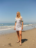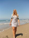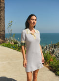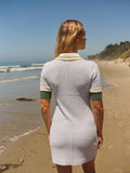 A short, textured knit polo dress in a soft light gray features a collared neckline with a yellow placket and buttons, plus sporty striped trim at the collar and sleeves. The straight silhouette with ribbed hem and contrast green sleeve cuffs gives it a casual, vintage tennis inspired look.