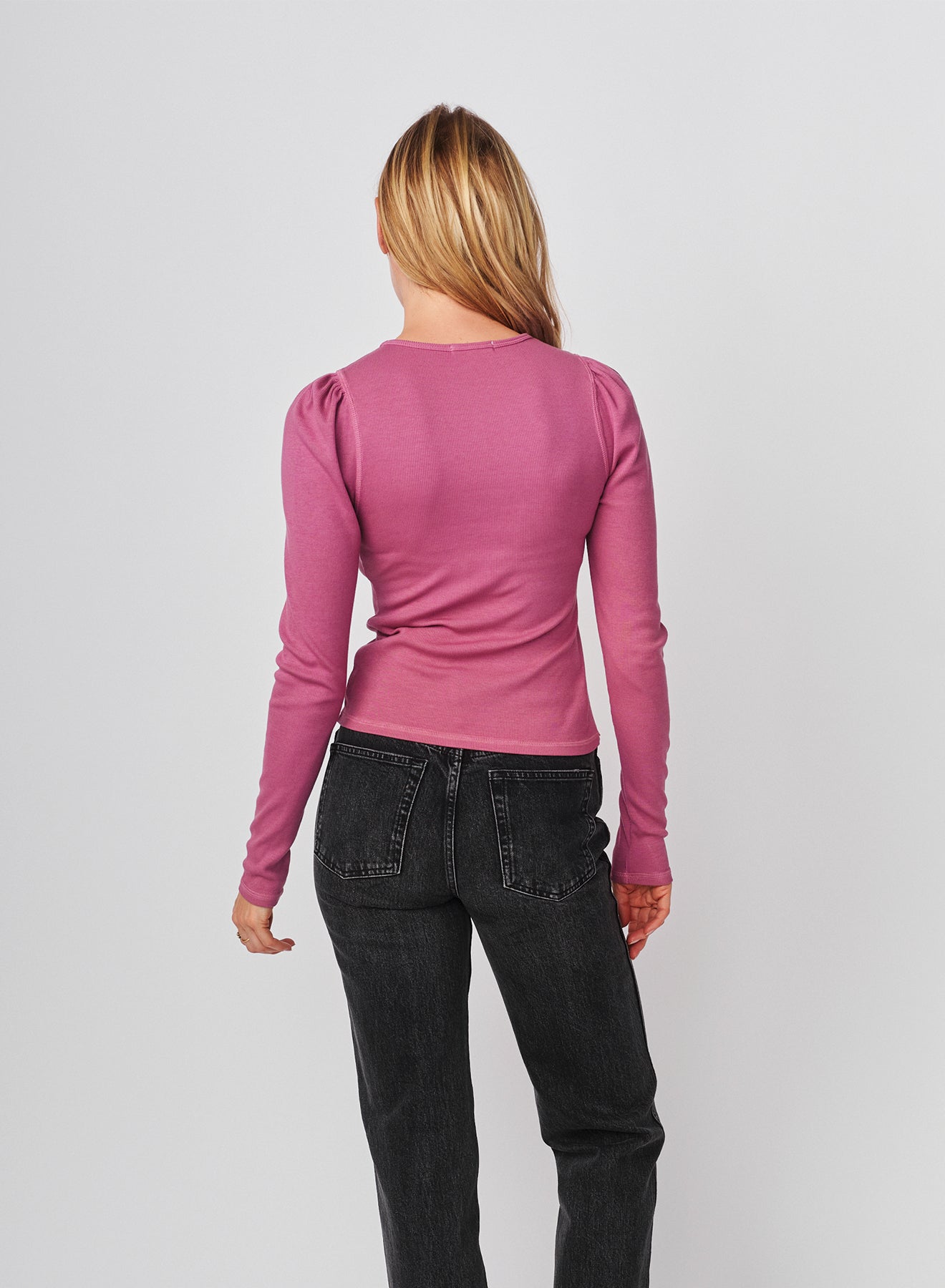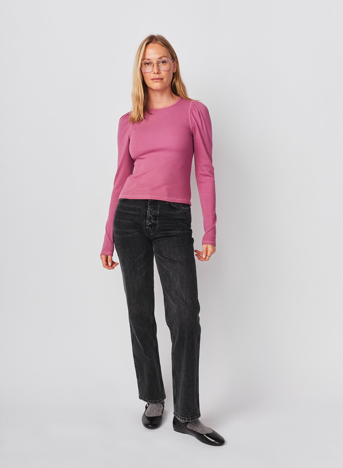 This long-sleeve top features subtle puff shoulders and a fitted silhouette for a feminine twist on a classic style. Soft and versatile, it’s perfect for layering or wearing on its own.