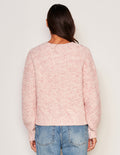 Crew neck sweater in a soft pink heater yarn with rib knit transfer for a flattering silhouette.