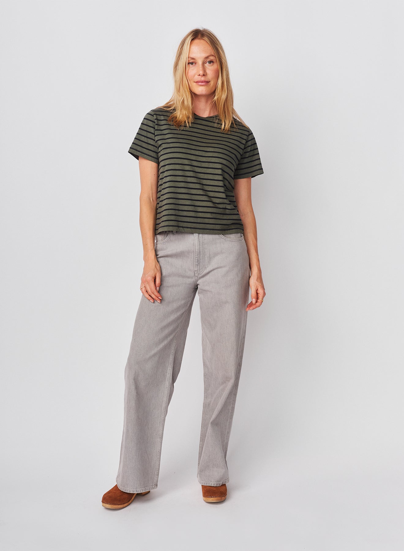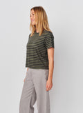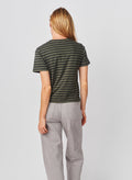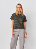This striped tee features a relaxed fit with a classic crew neckline, blending effortless comfort with a timeless, everyday look.