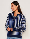 Crew neck sweater with lace up neckline detail in multi-blue stripes.