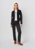 This sporty knit jacket features a zip-front design with contrast trim and bold side stripes for a modern, athletic touch. Ribbed cuffs and hem add structure to its relaxed silhouette, making it a chic layer for casual days.