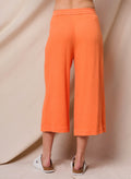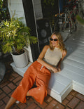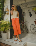 These wide-leg trousers in a bold, sun-kissed orange offer breezy comfort with a relaxed fit and soft cotton gauze texture. Featuring a drawstring waist and cropped length, they’re the perfect blend of effortless California cool and laid-back French chic.