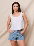 This French-inspired, California-born flutter top features a breezy cropped silhouette with soft ruffled straps for a touch of feminine charm. Its lightweight fabric makes it perfect for effortless, sunny-day styling.
