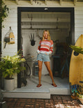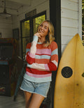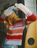 Bright and playful, this striped mesh-knit pullover channels carefree California days with a punch of French charm. Featuring airy open stitching and a bold mix of sunset-inspired hues, it’s the perfect lightweight layer for beach bonfires or morning coffee runs.
