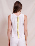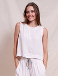 A loose cropped shell tank top with button closures on the back. Soft silky textures for a warm day. Paired with our wide leg pant.
