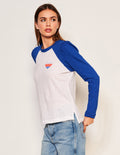 Long sleeve tee in Supima slub jersey fabrication with contrast color sleeve and graphic detail.