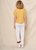 This daffodil yellow tee features a relaxed fit with a crew neckline and short sleeves. The front showcases a retro “LE WEEKEND VIBES” graphic with a sunset motif for a laid-back, playful touch.
