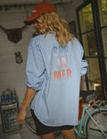 This oversized blue-and-white striped shirt features a mix of vertical and horizontal stripe placement, a chest pocket, and a sweet embroidered heart at the cuff. The back adds a playful touch with a bold "SUR LA MER" graphic in a vibrant ombré finish.